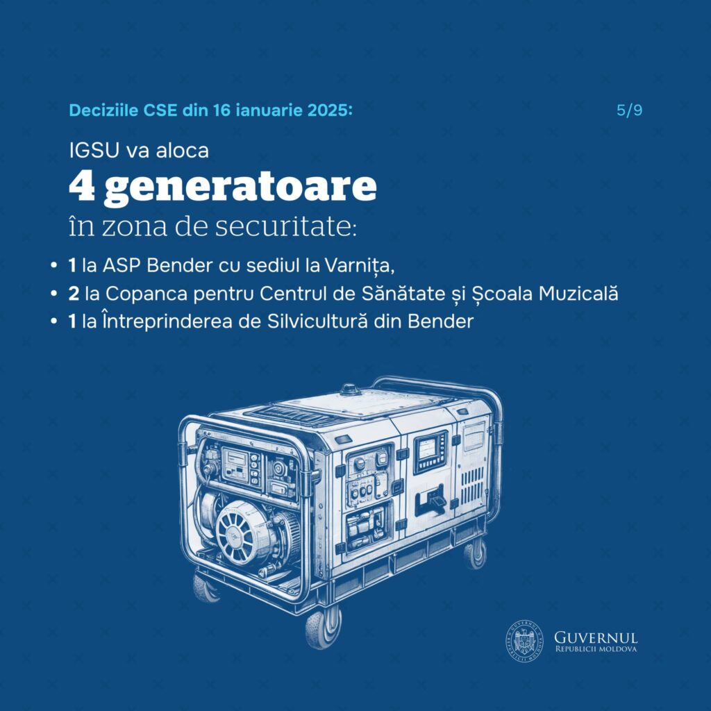 The General Inspectorate for Emergency Situations of the Ministry of Internal Affairs continues to demonstrate its commitment to the community. Following the CES decision, electric generators will be temporarily transferred free of charge to the Bender ID Issuing Unit of the Public Services Agency, the “Tighina Forestry Enterprise” of the “Moldsilva” Agency and the Copanca local government, Causeni rayon.